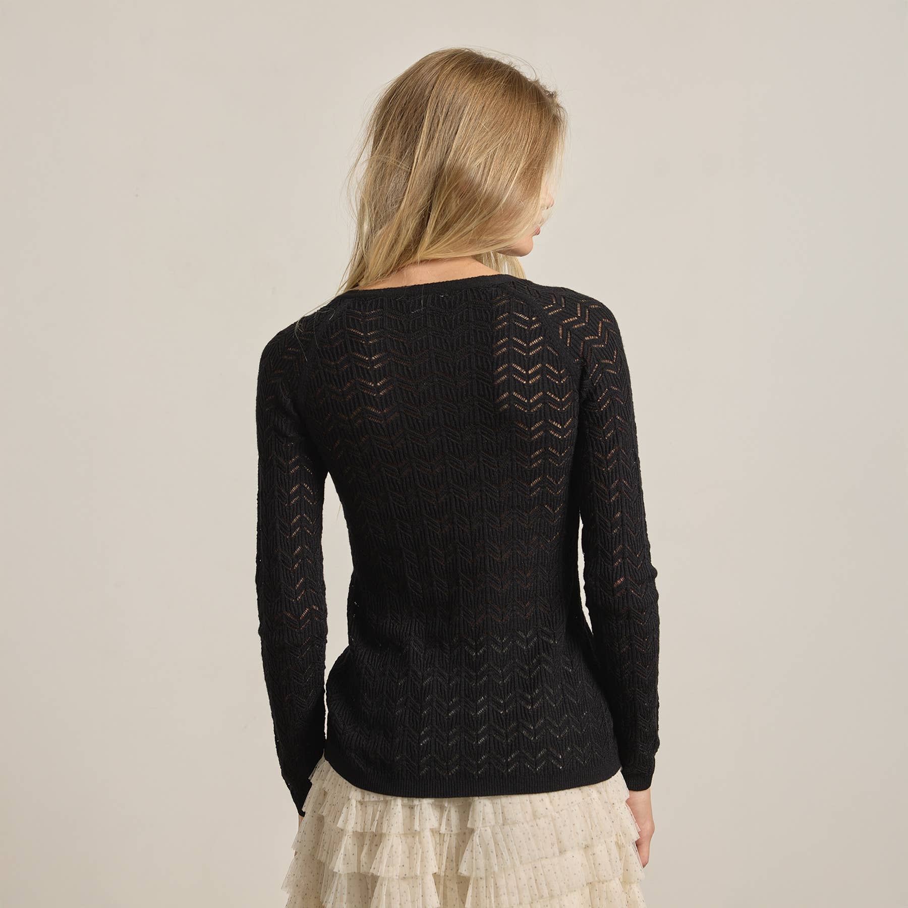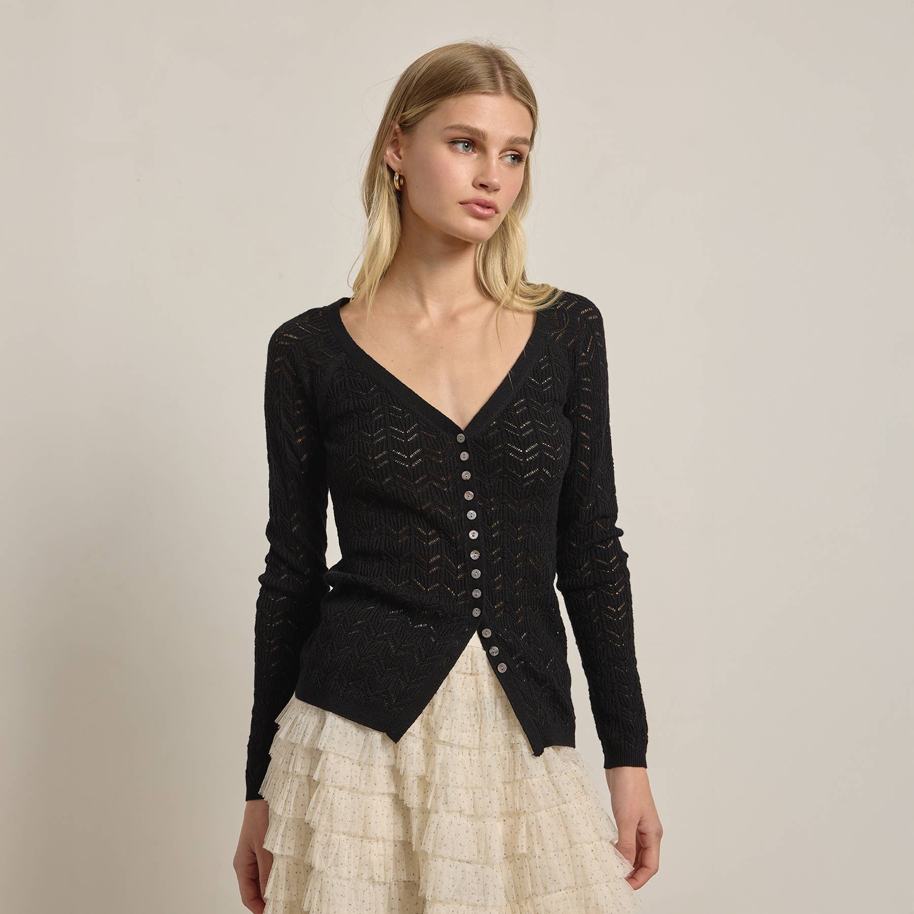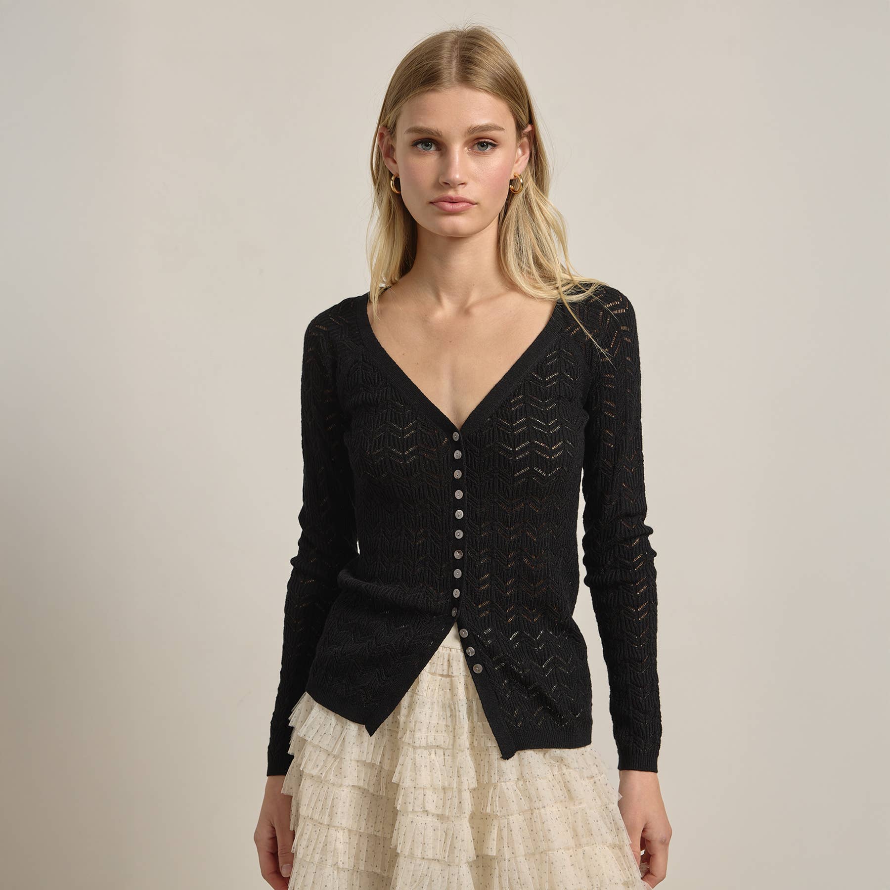 A delicate chevron-pattern knit cardigan featuring a slim silhouette and soft touch. Designed with a feminine deep V-neckline and covered button-down closure for an elegant touch. Perfect for layering over camisoles or dresses through transitional seasons. Chevron textured knit pattern - Slim fit silhouette - Deep V-neckline with button front - Lightweight & breathable knit