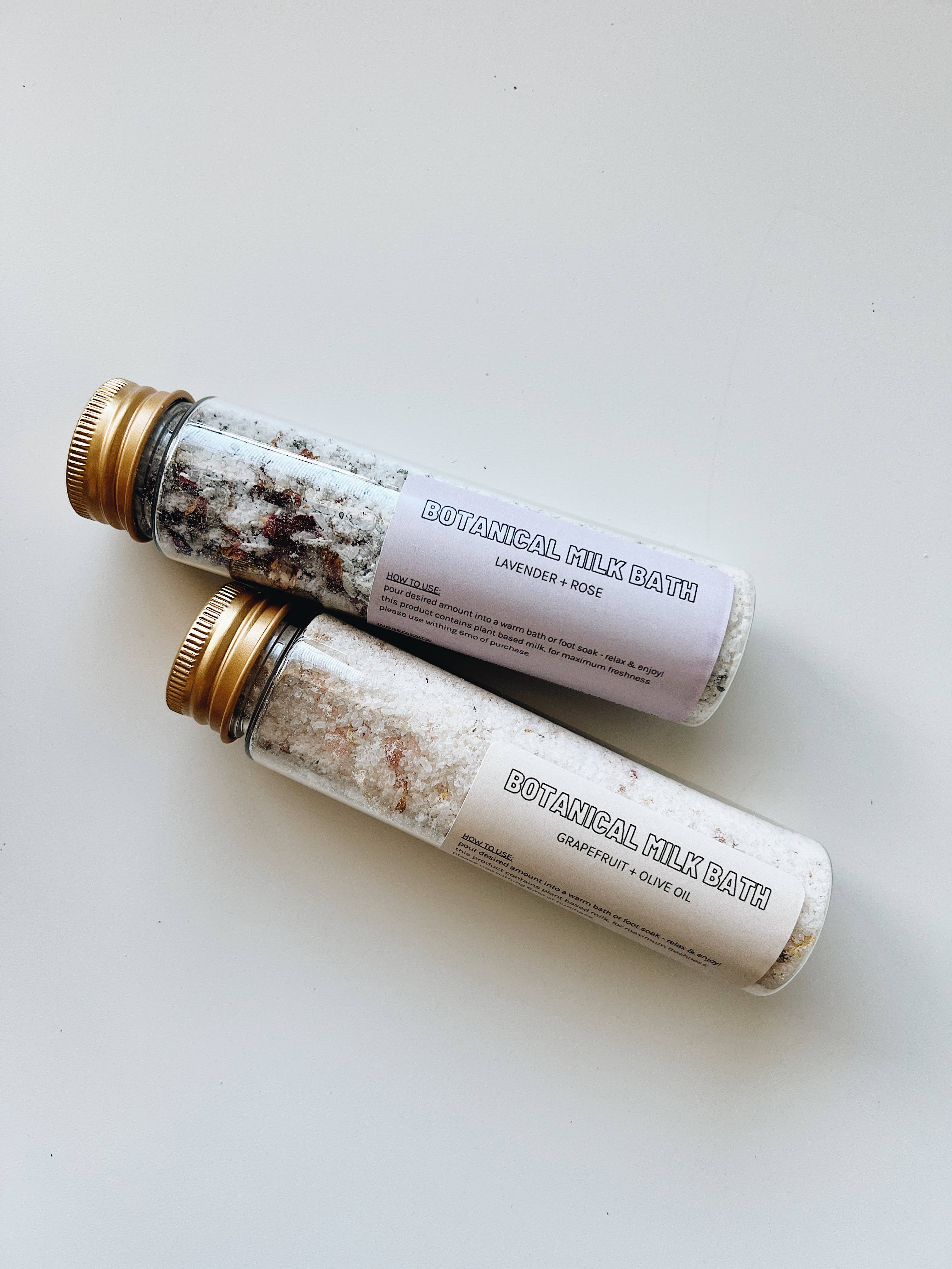 Transform your bath into a luxurious escape with this delightful milk bath blend. Grapefruit and olive oil dance with Himalayan rock salt and creamy coconut milk, creating a soothing soak that softens skin while calming the senses. Infused with dried botanicals and a carefully crafted fragrance and essential oil blend, this 3.5oz tube brings spa-quality relaxation straight to your tub. Pure indulgence in every soak.
