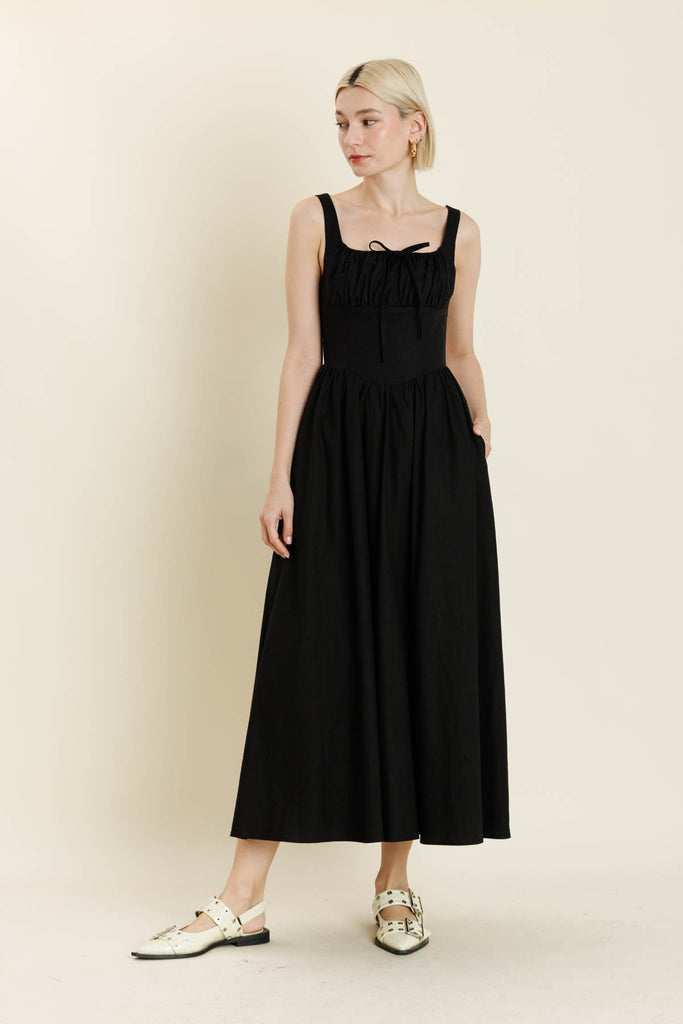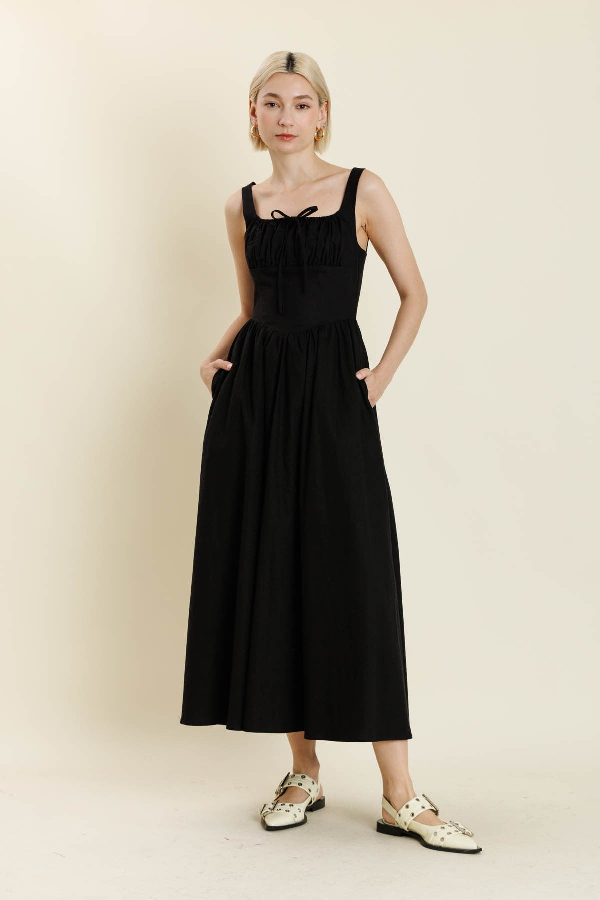The Issadora Dress in Black brings effortless charm with its non-stretch linen fabric and playful ruched bodice featuring adjustable ties. Its elasticated, smocked back and zipper closure ensure a comfy, flattering fit, while side seam floating pockets add a fun, practical touch. Perfect for those who love style with a little twist!