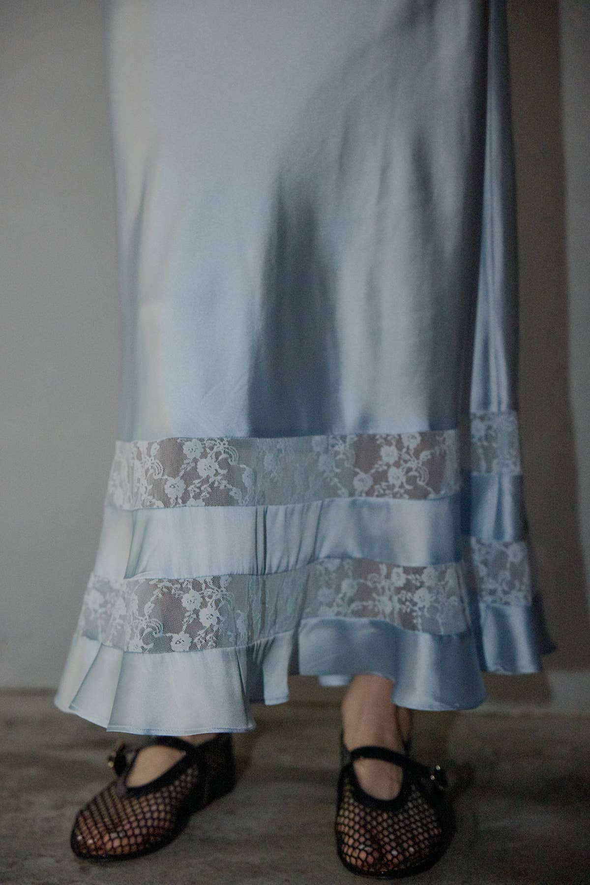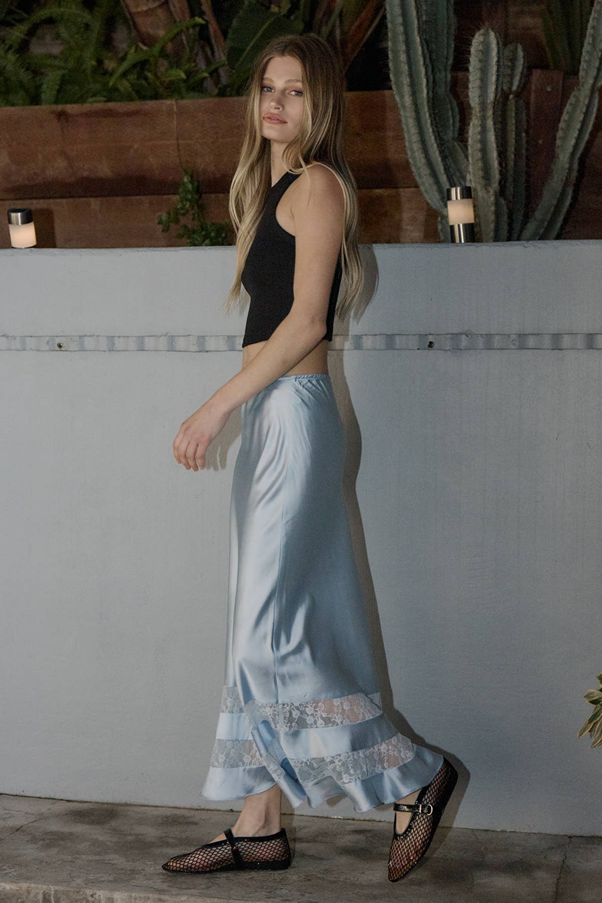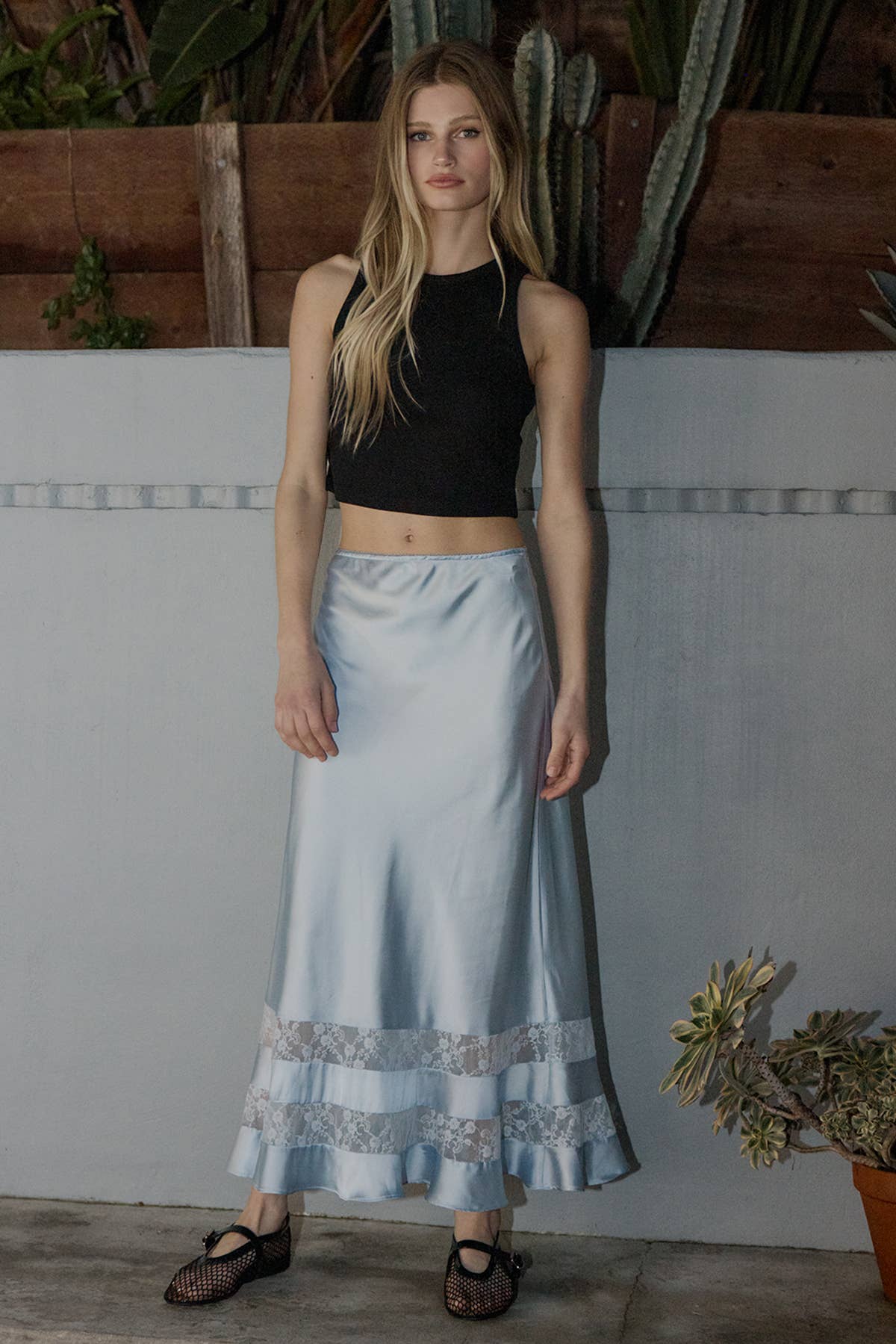 Nancy Satin Lace Trim Midi Skirt
