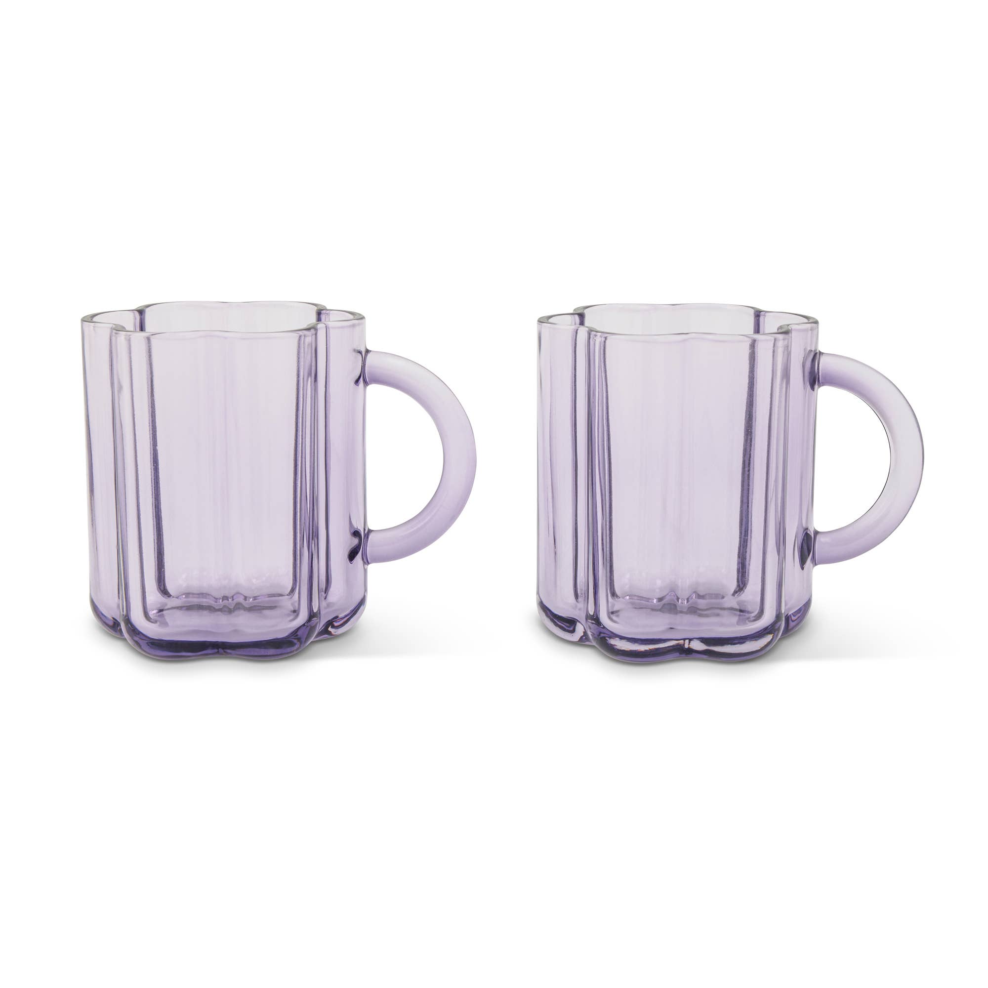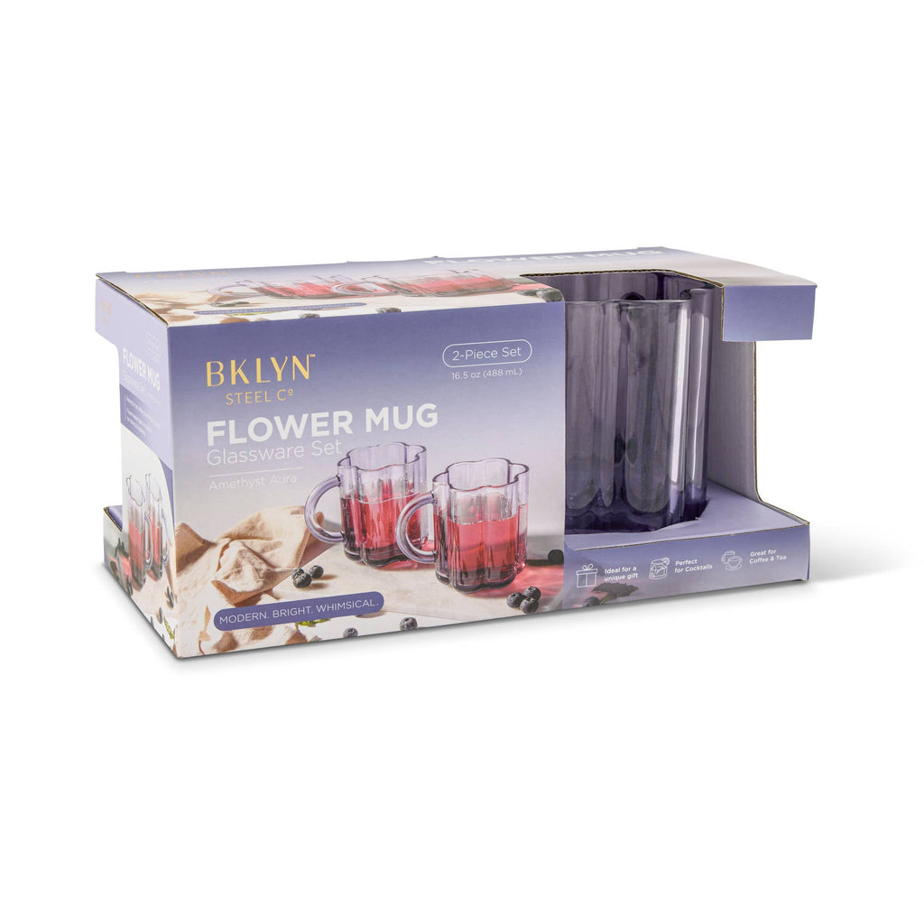 Set of two flower-shaped glass mugs. 16.5oz capacity. Perfect for tea, coffee, and whimsical cocktails. Flower-shaped glass is beautiful for hosting and displaying. Modern, bright and whimsical. Ideal for a unique gift.