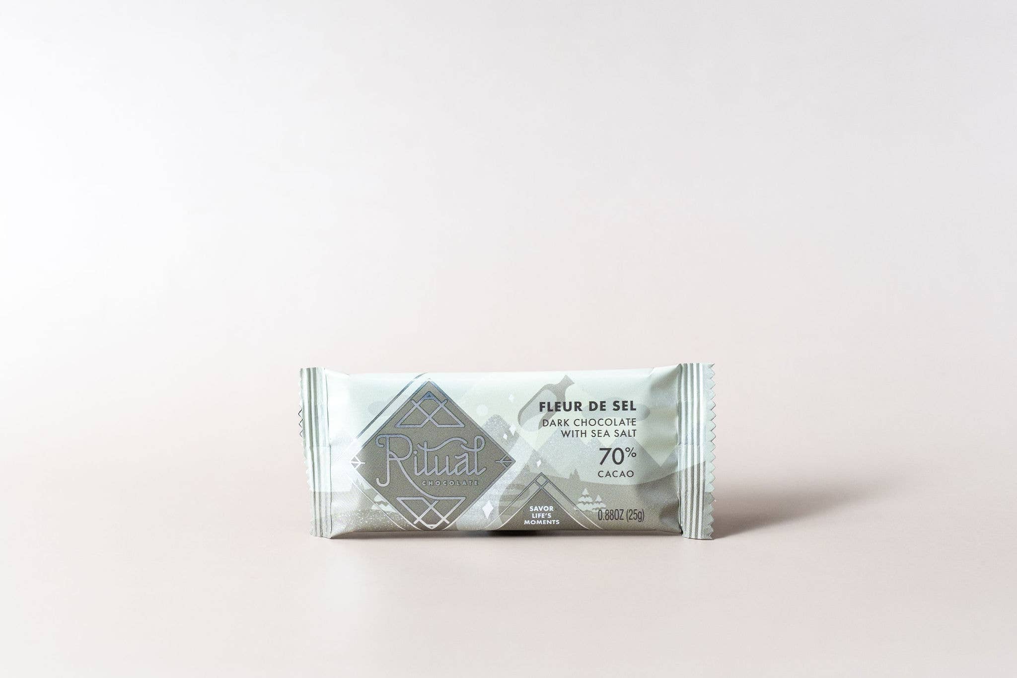 One of our most loved bars, now in a perfectly portioned mini. This bite-sized version features delicate French Fleur de Sel “Flower of Salt” paired with our signature Mid Mountain 70% dark chocolate, a smooth, complex blend of cacao sourced from small farms around the world. The salt’s crisp, delicate flakes melt with each bite, heightening the chocolate’s subtle tasting notes and creating a lingering, balanced finish. Size: 0.88oz (25g), 1 serving per mini bar Ingredients: Organic Cacao, Organic Cane Sugar, Organic Cocoa Butter, Fleur de Sel Allergens: May contain traces of Peanuts, Tree Nuts & Wheat.