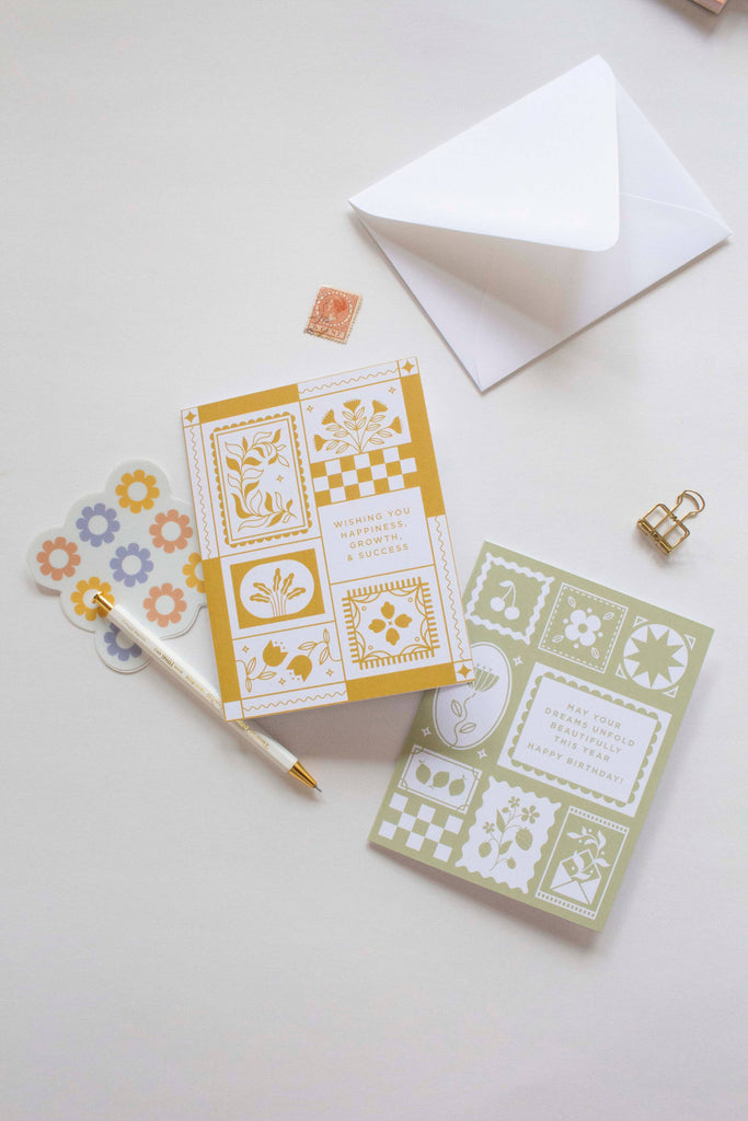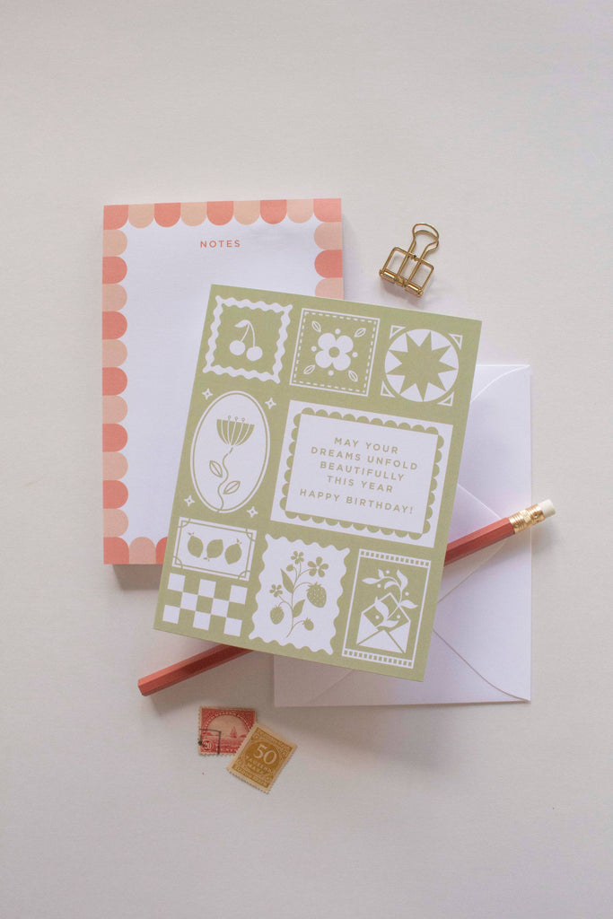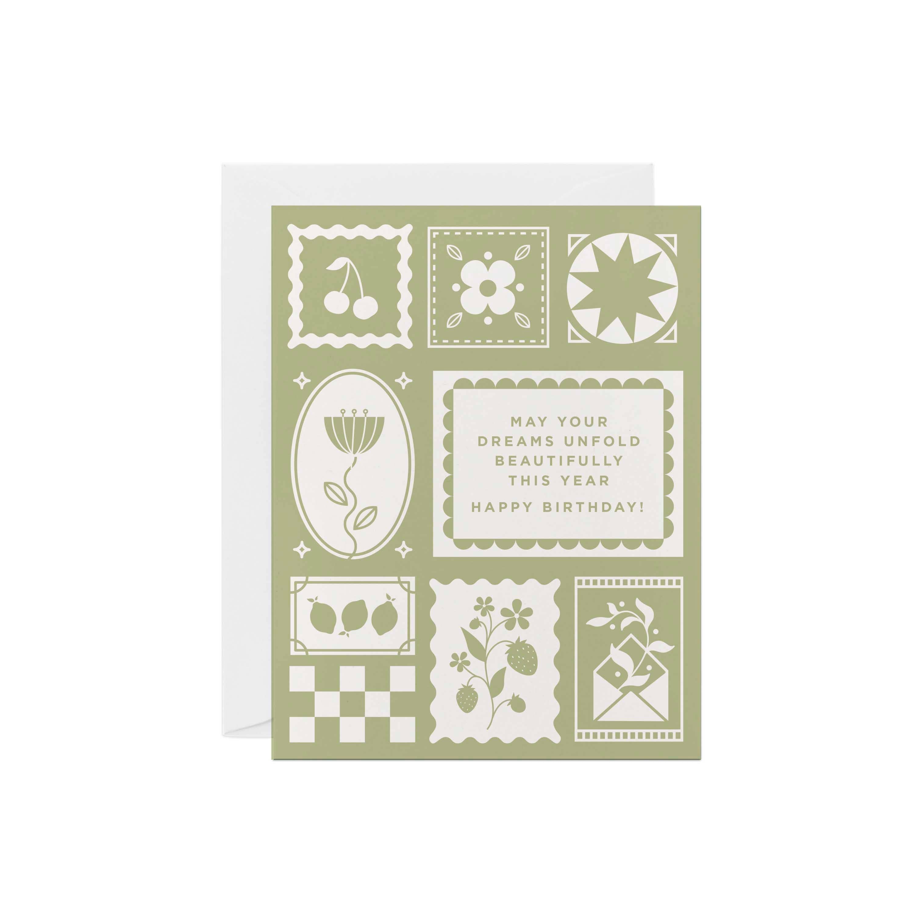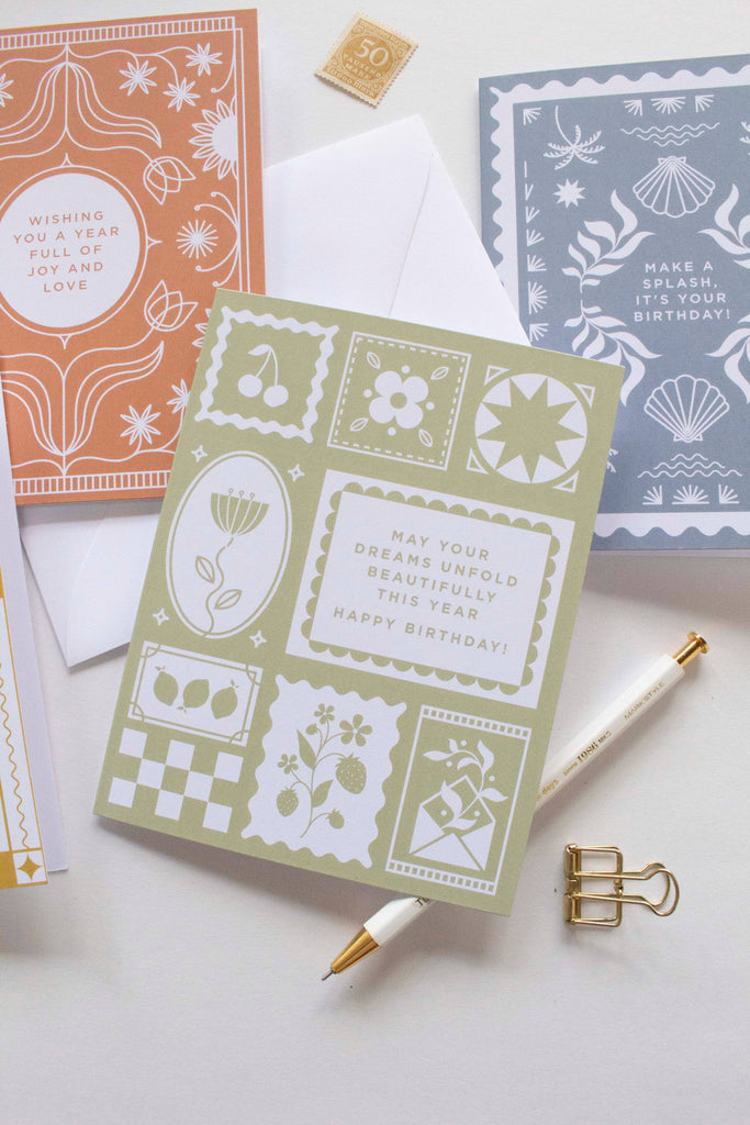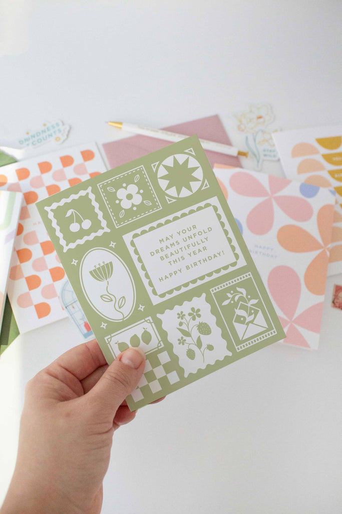 Design Details: A playful arrangement of stamp-style designs featuring florals, cherries, and intricate geometric patterns. Centered is the uplifting message, "May your dreams unfold beautifully this year. Happy Birthday!"